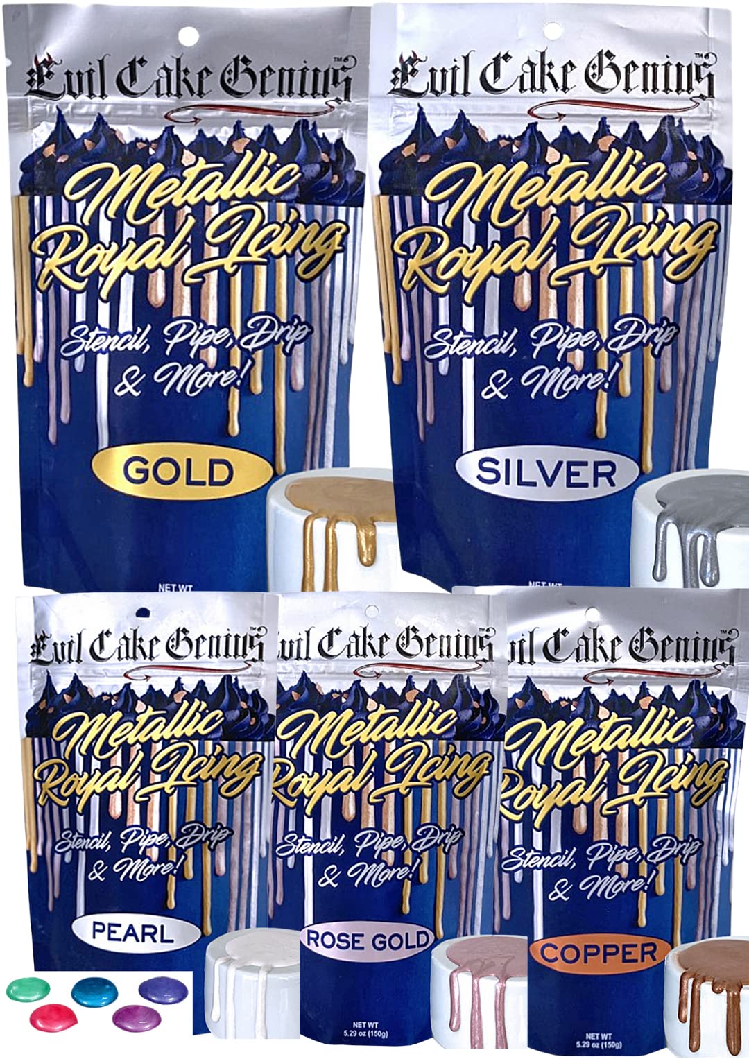 Amazon Com Evil Cake Genius Set Of 5 Metallic Royal Icings Gold Silver Rose Gold Copper Pearl Grocery Gourmet Food